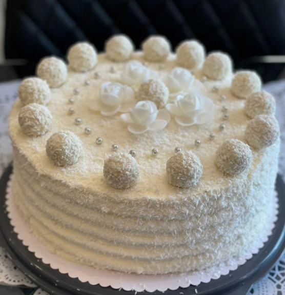 Сверху украсить конфетами Рафаэлло или на Ваше усмотрение и оставить торт на ночь в холодильнике.